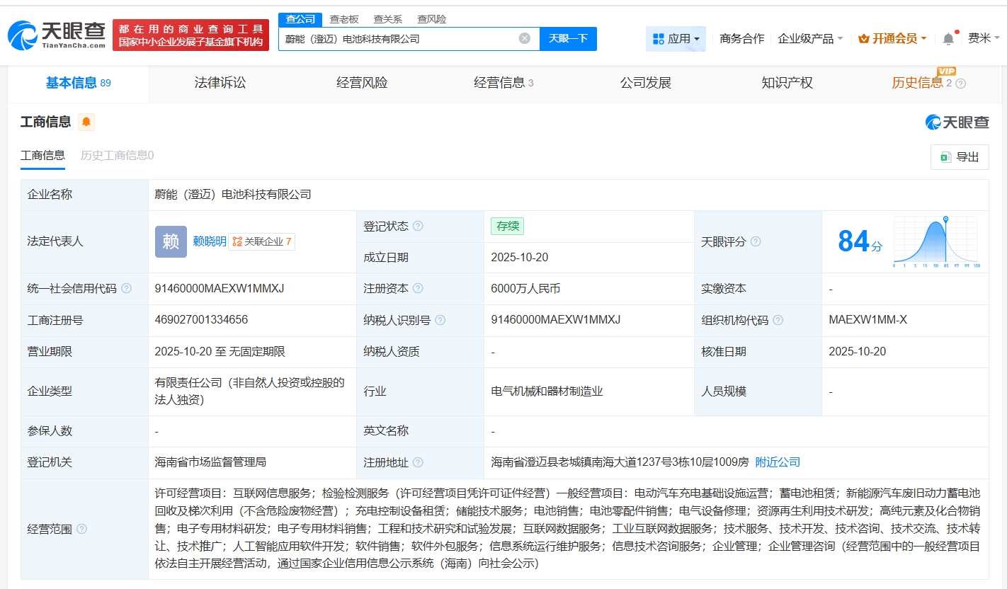 天眼查App显示,近日,蔚能(澄迈)电池科技有限公司成立股票能配资吗,法定代表人为赖晓明,注册资本6000万人民币,经营范围包括电动汽车充电基础设施运营、蓄电池租赁、新能源汽车废旧动力蓄电池回收及梯次利用等。股东信息显示,该公司由武汉蔚能电池资产有限公司全资持股。